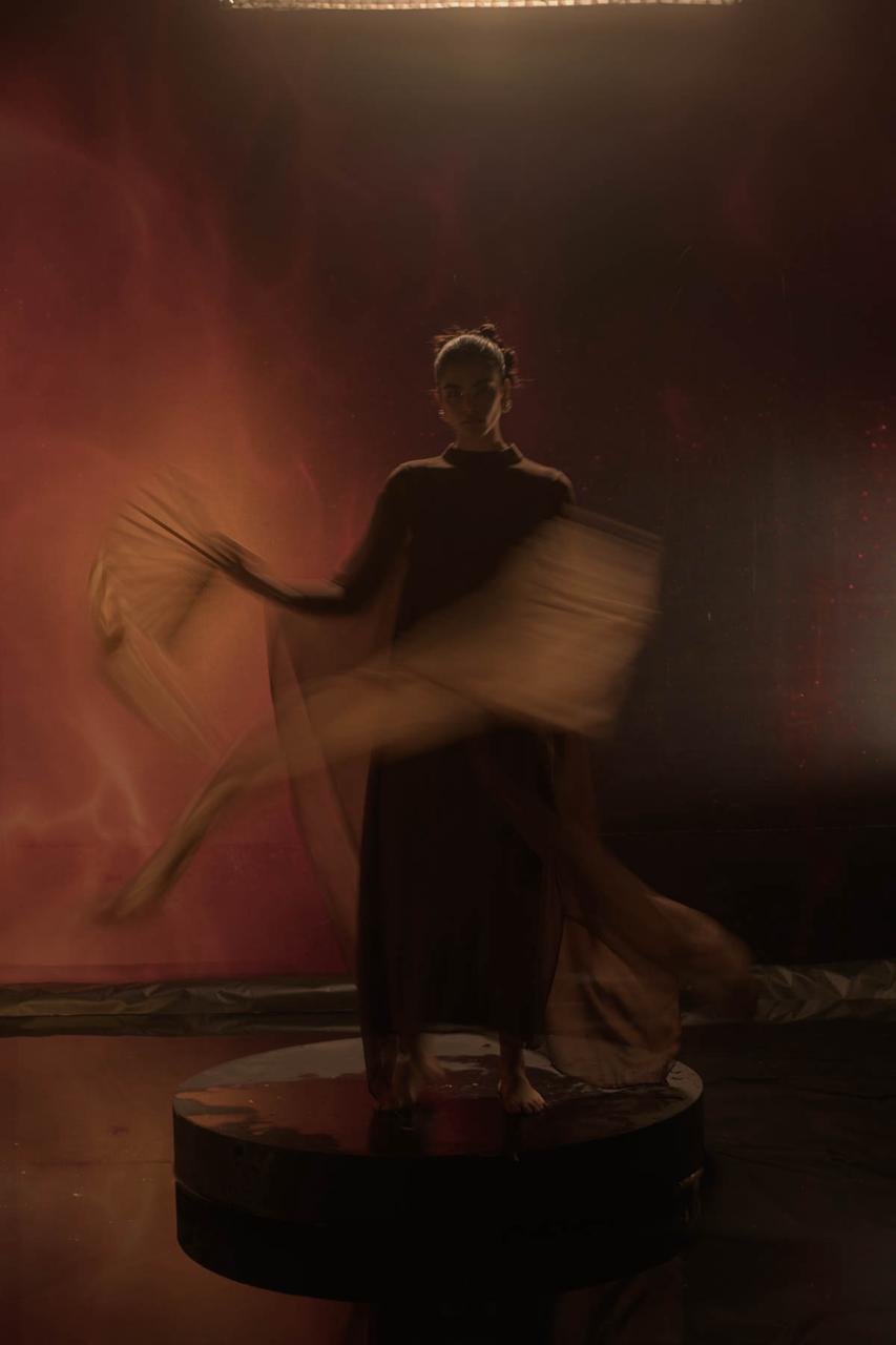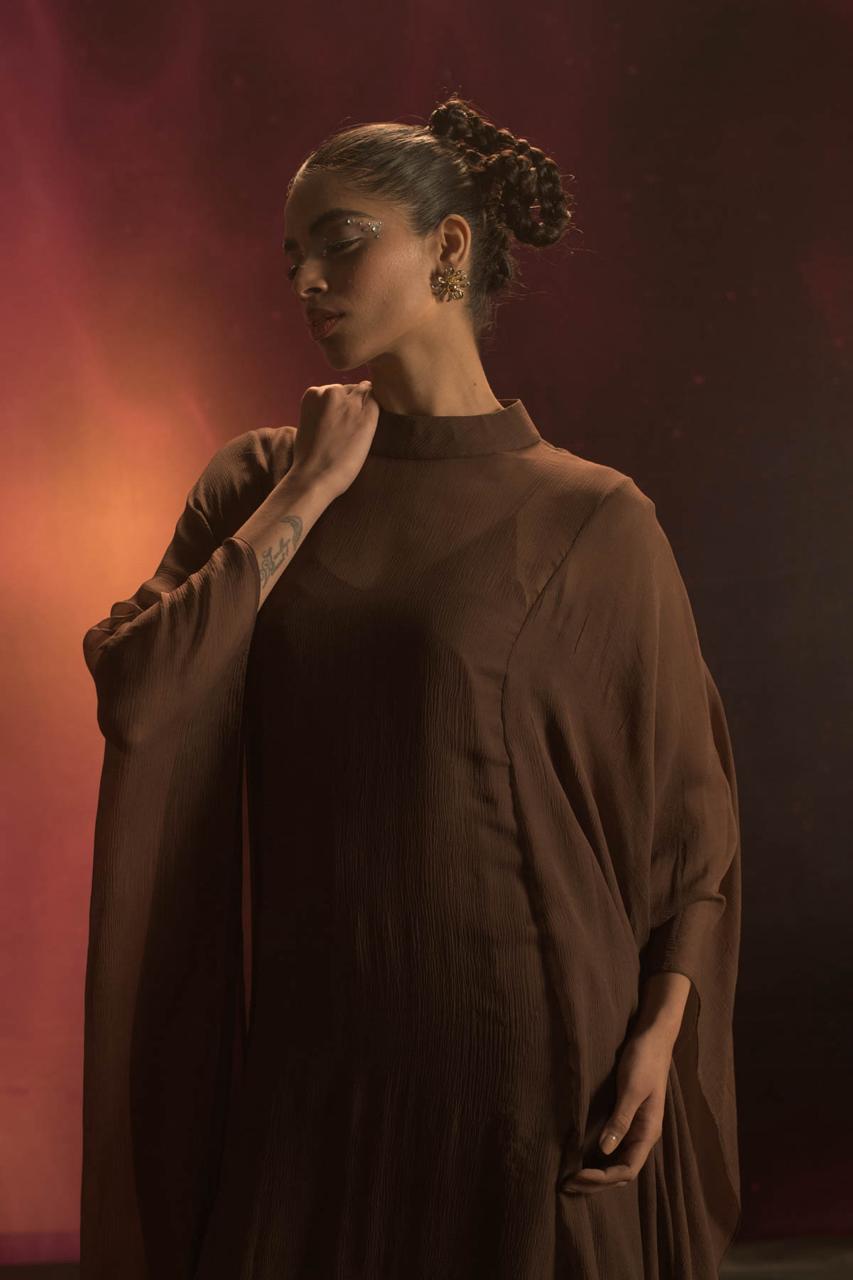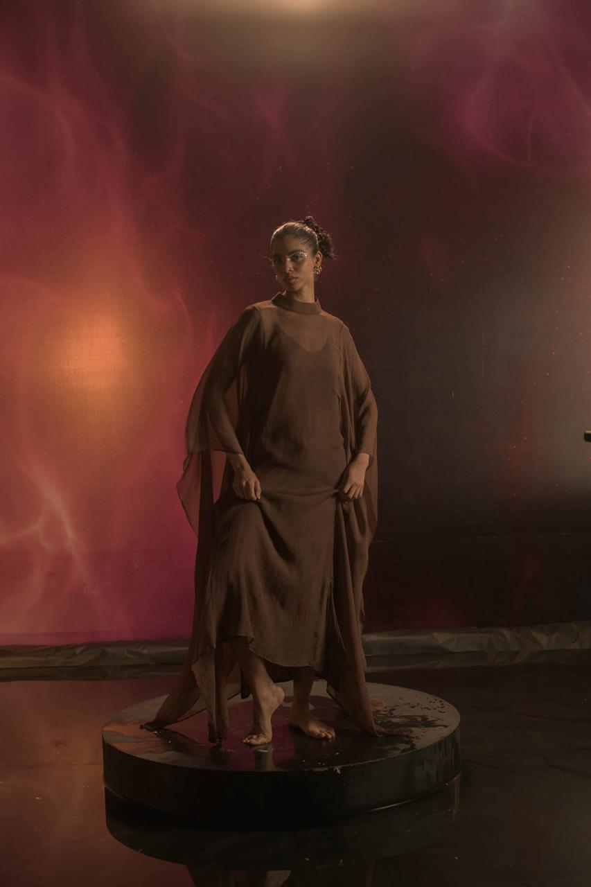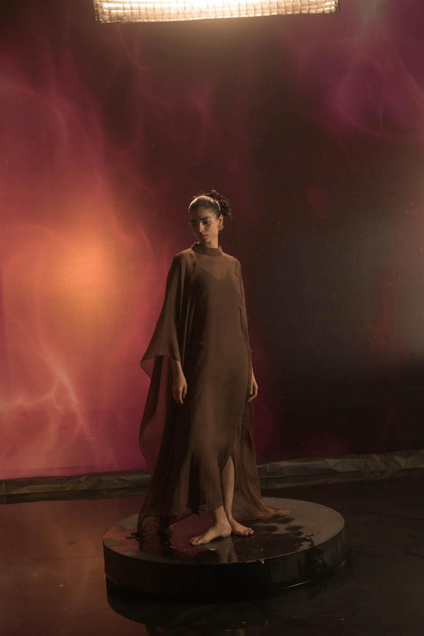 Crafted in sheer pure chiffon, this full-length kaftaan features an elegant zero neckline and fluid, flowing sleeves that create a soft, graceful silhouette. It is layered over a full-length slip made in breathable Bemberg muslin cotton, designed with delicate noodle straps for ease and comfort. Both layers feature side slits for movement, while the kaftaan is finished with a clean back zip closure, blending lightness with refined structure.