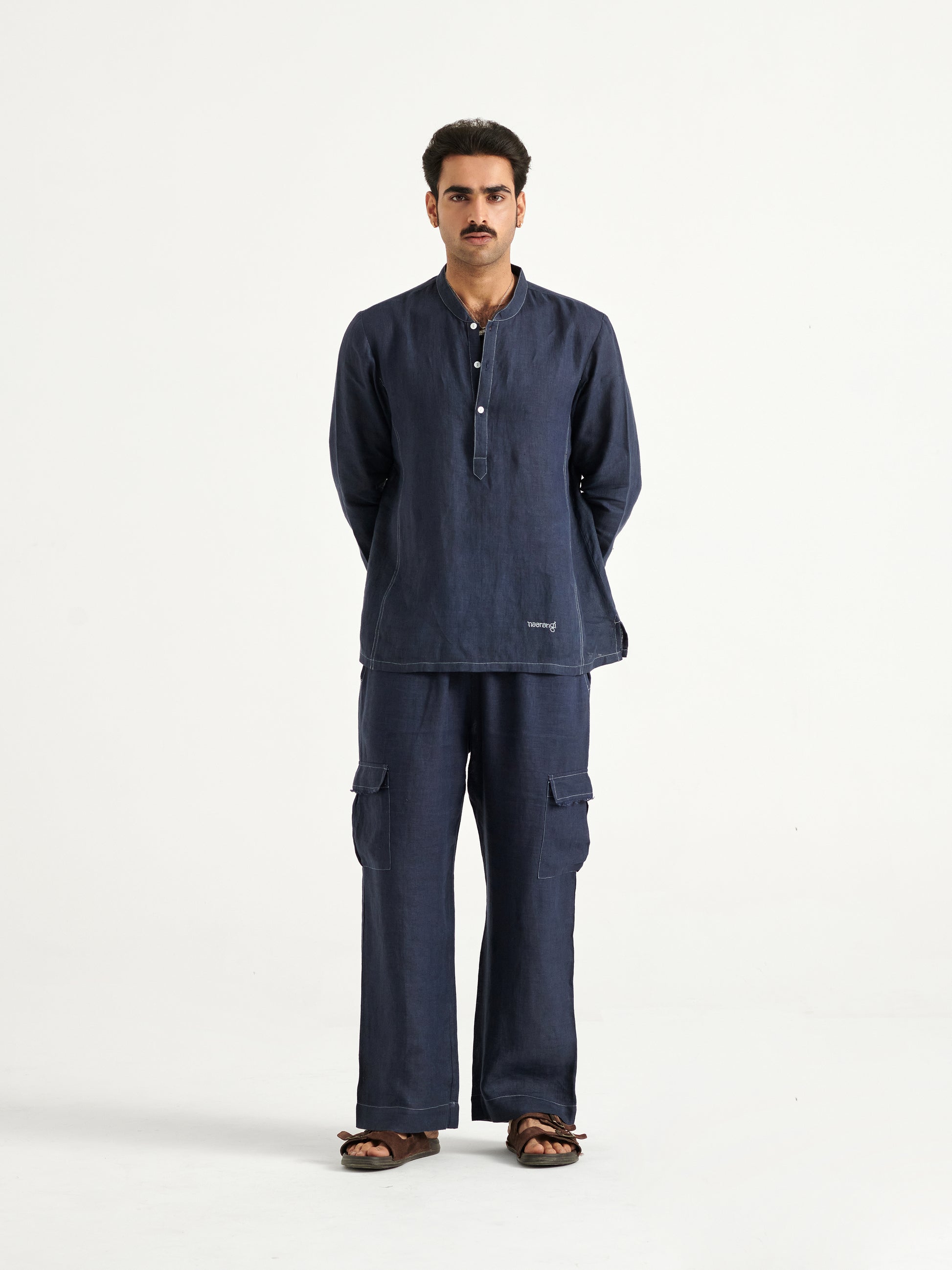 Crafted in breathable linen, our relaxed-fit Ruh kurta features a refined Chinese collar and subtle accent stitch lines that add structure and character to the silhouette. The back is highlighted with intricate hand embroidery of a shell motif, symbolizing resonance and sound, a key element within the Vyom collection. The design blends understated tailoring with artisanal detail for a modern yet timeless look.